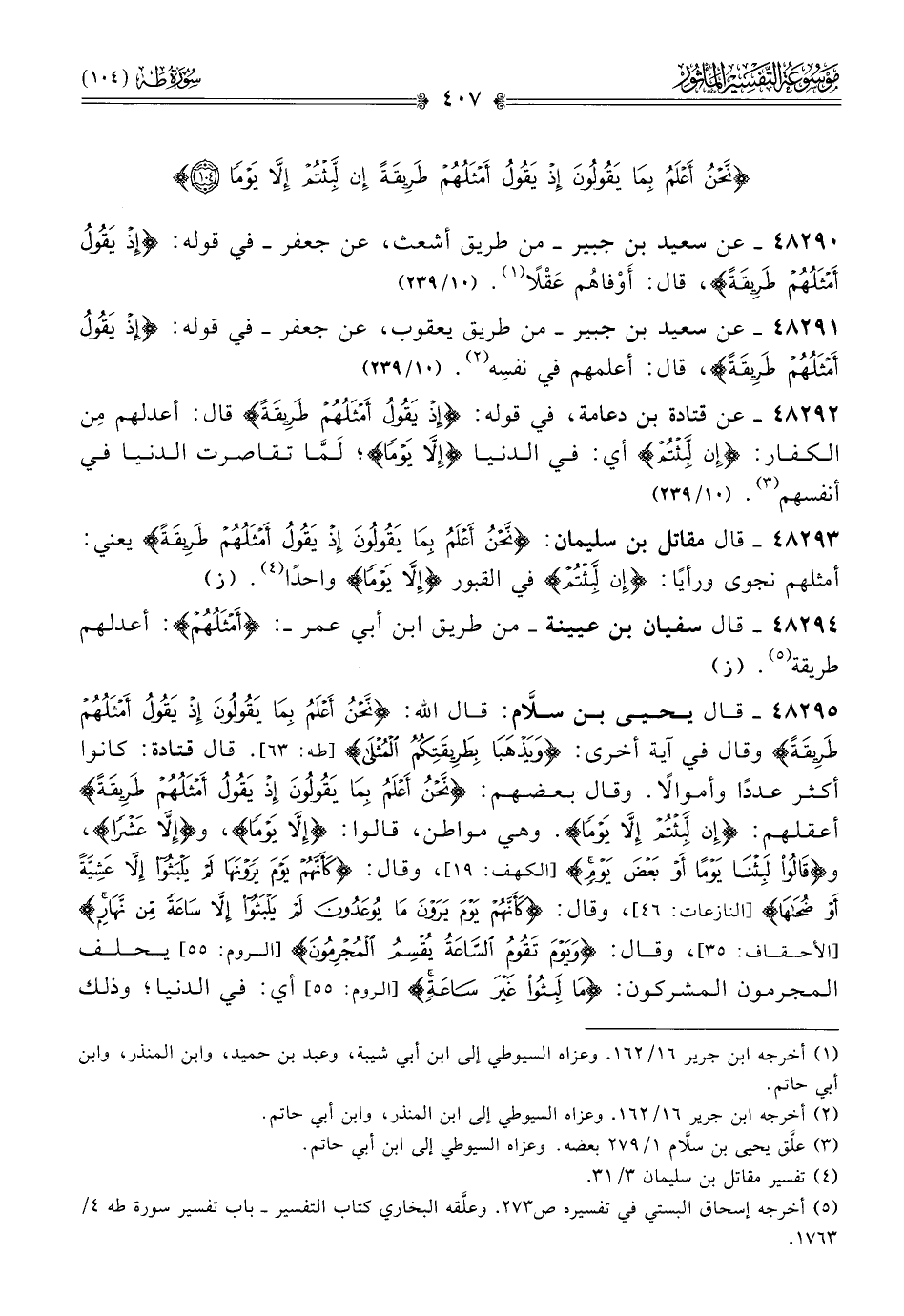 ٤٨٢٩٥ - قال يحيى بن سلّام: قال الله: {نحن أعلم بما يقولون إذ يقول أمثلهم طريقة} وقال في آية أخرى: {ويذهبا بطريقتكم المثلى} [طه: ٦٣]. قال قتادة: كانوا أكثر عددًا وأموالًا. وقال بعضهم: {نحن أعلم بما يقولون إذ يقول أمثلهم طريقة} أعقلهم: {إنْ لَبِثْتُمْ إلا يَوْمًا}. وهي مواطن، قالوا: {إلا يوما}، و {إلا عشرا}، و {قالوا لبثنا يوما أو بعض يوم} [الكهف: ١٩]، وقال: {كأنهم يوم يرونها لم يلبثوا إلا عشية أو ضحاها} [النازعات: ٤٦]، وقال: {كأنهم يوم يرون ما يوعدون لم يلبثوا إلا ساعة من نهار} [الأحقاف: ٣٥]، وقال: {ويوم تقوم الساعة يقسم المجرمون} [الروم: ٥٥] يحلف المجرمون المشركون: {ما لبثوا غير ساعة} [الروم: ٥٥] أي: في الدنيا؛ وذلك