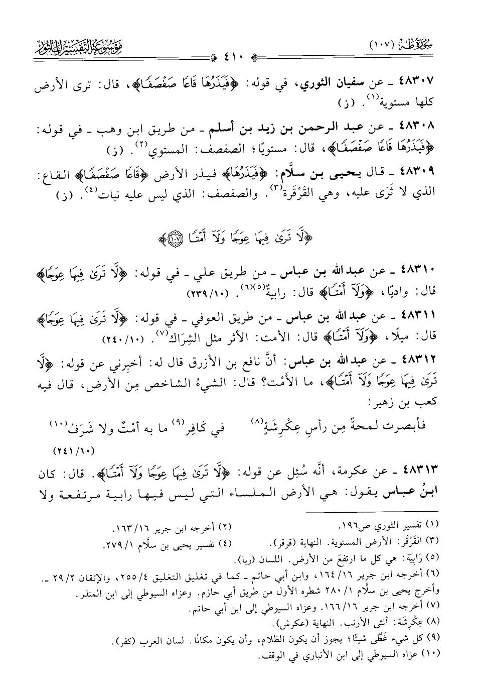 ٤٨٣١٠ - عن عبد الله بن عباس -من طريق علي- في قوله: {لا ترى فيها عوجا} قال: واديًا، {ولا أمتا} قال: رابيةً (¬٥) (¬٦). (١٠/ ٢٣٩)