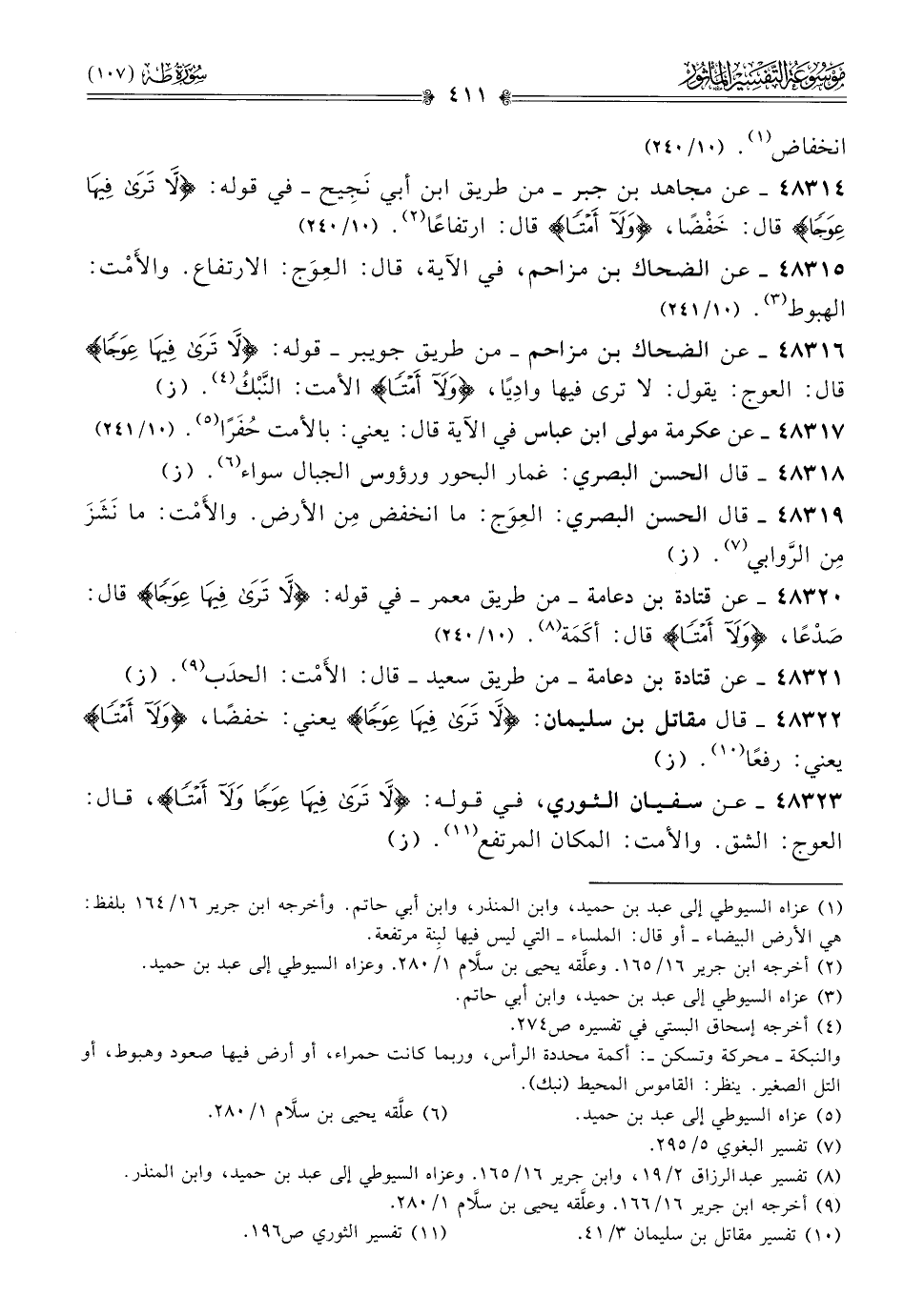 ٤٨٣٢٣ - عن سفيان الثوري، في قوله: {لا ترى فيها عوجا ولا أمتا}، قال: العوج: الشق. والأمت: المكان المرتفع (¬١١). (ز)