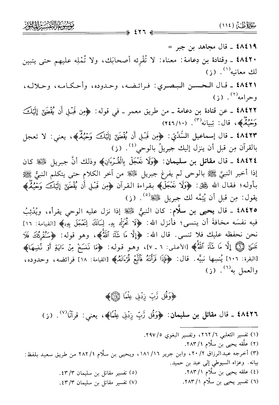 ٤٨٤٢٢ - عن قتادة بن دعامة -من طريق معمر- في قوله: {من قبل أن يقضى إليك وحيه}، قال: تِبيانه (¬٣). (١٠/ ٢٤٦)