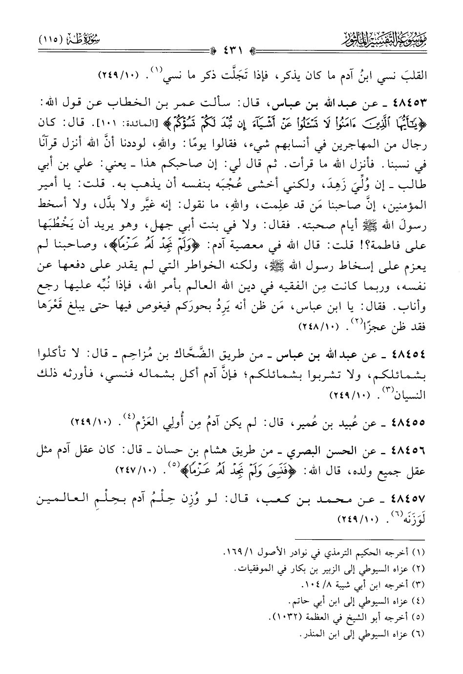 ٤٨٤٥٦ - عن الحسن البصري -من طريق هشام بن حسان- قال: كان عقل آدم مثل عقل جميع ولده، قال الله: {فنسي ولم نجد له عزما} (¬٥). (١٠/ ٢٤٧)