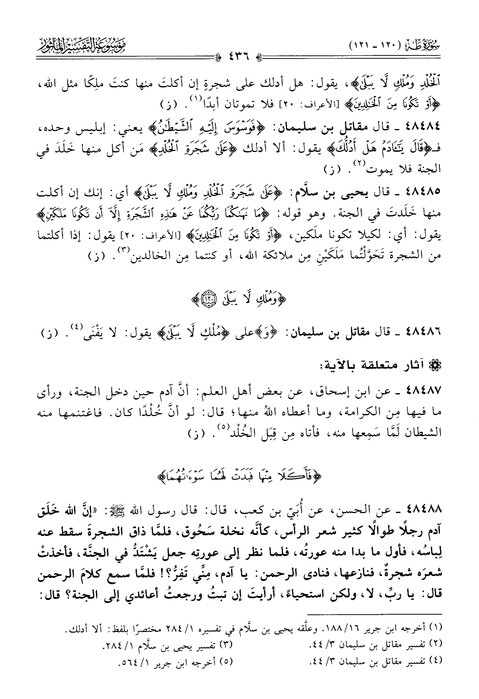 ٤٨٤٨٦ - قال مقاتل بن سليمان: {و} على {ملك لا يبلى} يقول: لا يَفْنى (¬٤). (ز)