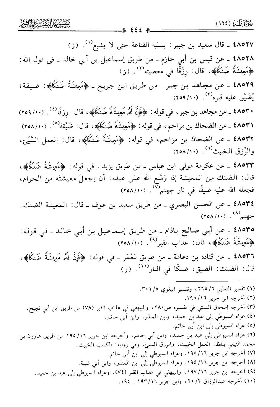 ٤٨٥٣٢ - عن الضحاك بن مزاحم، في قوله: {معيشة ضنكا}، قال: العمل السَّيِّئ، والرِّزق الخبيث (¬٦). (١٠/ ٢٥٨)