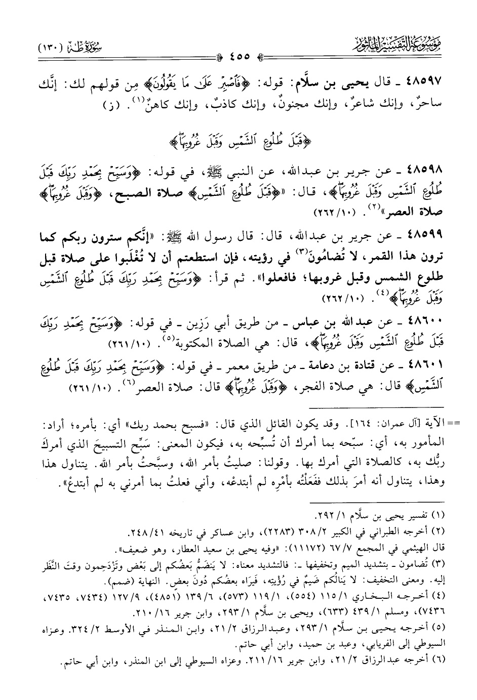 ٤٨٥٩٨ - عن جرير بن عبد الله، عن النبي - صلى الله عليه وسلم -، في قوله: {وسبح بحمد ربك قبل طلوع الشمس وقبل غروبها}، قال: «{قبل طلوع الشمس} صلاة الصبح، {وقبل غروبها} صلاة العصر» (¬٢). (١٠/ ٢٦٢)