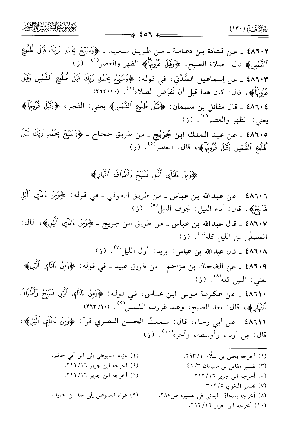 ٤٨٦٠٢ - عن قتادة بن دعامة -من طريق سعيد- {وسبح بحمد ربك قبل طلوع الشمس} قال: صلاة الصبح. {وقبل غروبها} الظهر والعصر (¬١). (ز)