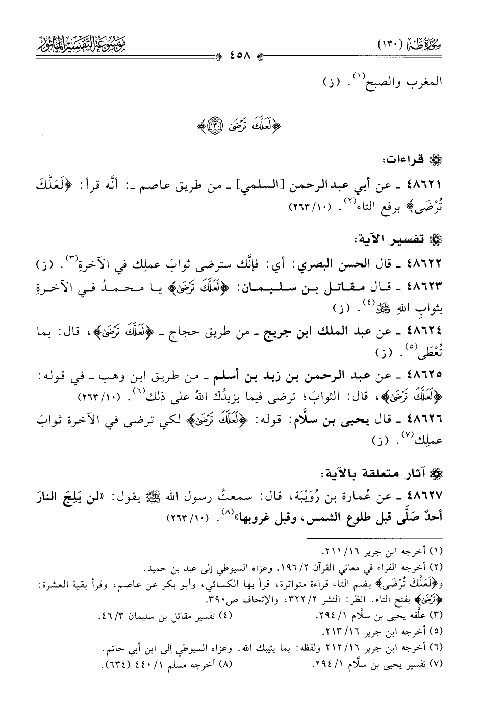 ٤٨٦٢١ - عن أبي عبد الرحمن [السلمي]-من طريق عاصم- أنّه قرأ: «لَعَلَّكَ تُرْضى» برفع التاء (¬٢). (١٠/ ٢٦٣)
