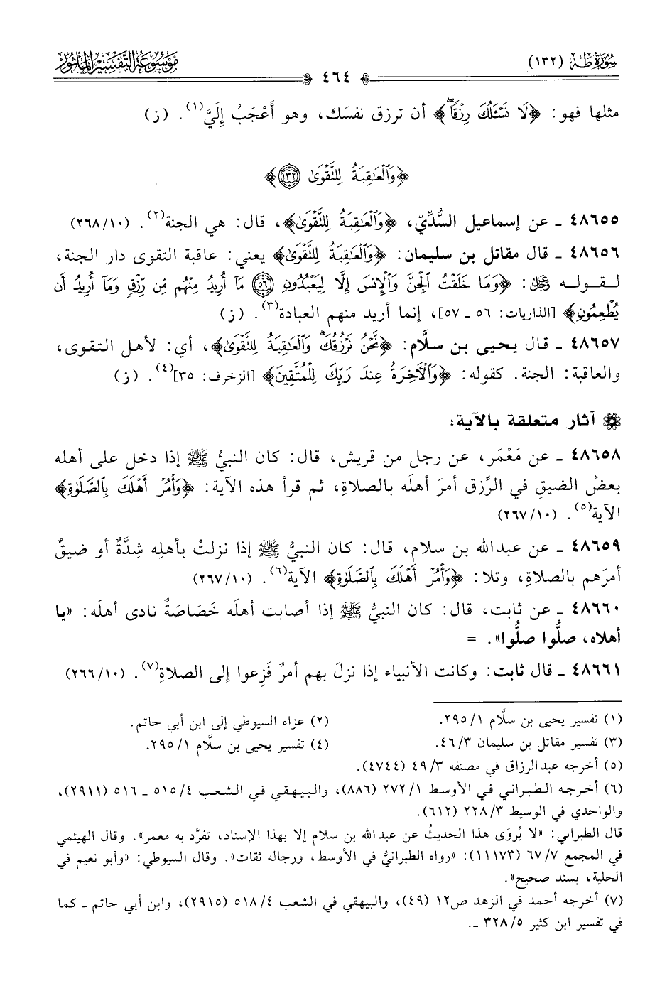 ٤٨٦٥٧ - قال يحيى بن سلّام: {نحن نرزقك والعاقبة للتقوى}، أي: لأهل التقوى، والعاقبة: الجنة. كقوله: {والآخرة عند ربك للمتقين} [الزخرف: ٣٥] (¬٤). (ز)