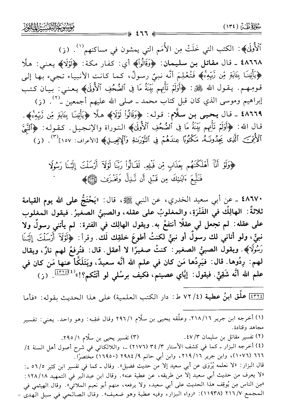 ٤٨٦٧٠ - عن أبي سعيد الخدري، عن النبي - صلى الله عليه وسلم -، قال: «يَحْتَجُّ على الله يوم القيامة ثلاثةٌ: الهالِكُ في الفَتْرَةِ، والمغلوبُ على عقله، والصبيُّ الصغيرُ. فيقول المغلوب على عقله: لم تجعل لي عقلًا أنتفعُ به. ويقول الهالِك في الفترة: لم يأتني رسولٌ ولا نبيٌّ، ولو أتاني لك رسولٌ أو نبيٌّ لكنتُ أطوعَ خلقِك لَك. وقرأ: {لولا أرسلت إلينا رسولا}. ويقول الصبيُّ الصغير: كنتُ صغيرًا لا أعقل. قال: فتُرفعُ لهم نارٌ، ويقال لهم: رِدُوها. قال: فيَرِدُها مَن كان في علم الله أنّه سعيدٌ، ويَتَلَكَّأ عنها مَن كان في علم الله أنّه شَقِيٌّ. فيقول: إيّاي عصيتم، فكيف برسُلي لو أتَتْكم؟!» (¬٤) [٤٣٢٤]. (ز)
