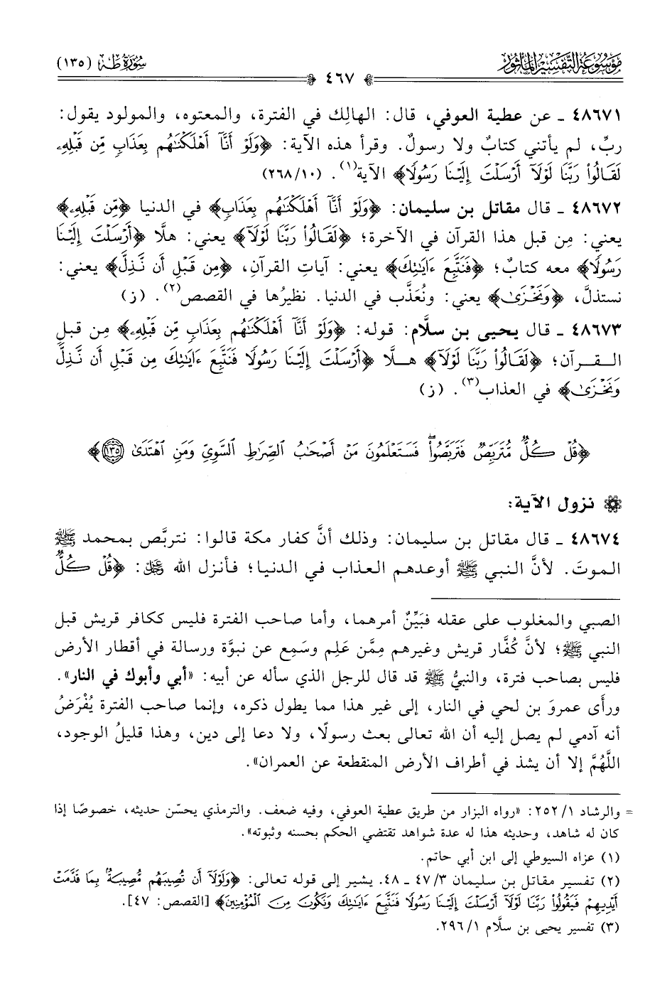 ٤٨٦٧١ - عن عطية العوفي، قال: الهالِك في الفترة، والمعتوه، والمولود يقول: ربِّ، لم يأتني كتابٌ ولا رسولٌ. وقرأ هذه الآية: {ولو أنا أهلكناهم بعذاب من قبله لقالوا ربنا لولا أرسلت إلينا رسولا} الآية (¬١). (١٠/ ٢٦٨)