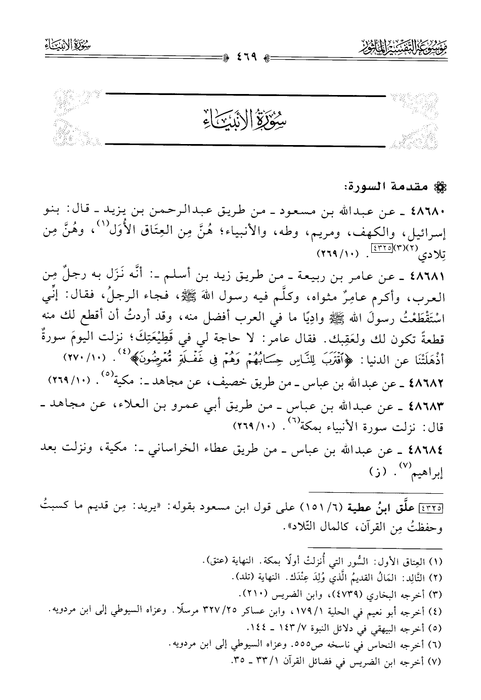 ٤٨٦٨٠ - عن عبد الله بن مسعود -من طريق عبد الرحمن بن يزيد- قال: بنو إسرائيل، والكهف، ومريم، وطه، والأنبياء؛ هُنَّ مِن العِتاق الأُوَل (¬١)، وهُنَّ مِن تِلادي (¬٢) (¬٣) [٤٣٢٥]. (١٠/ ٢٦٩)