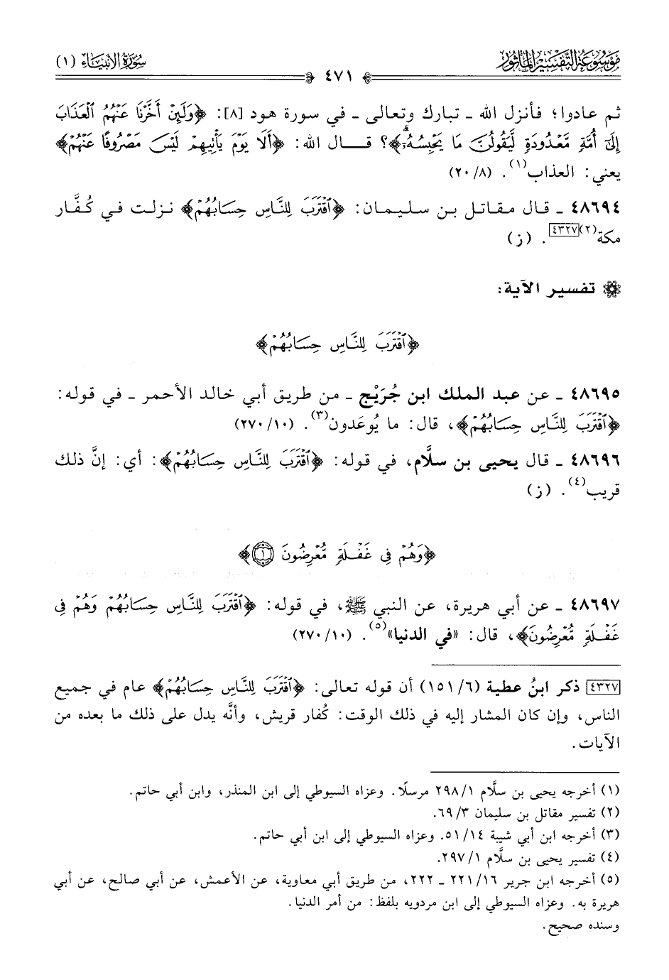 ٤٨٦٩٧ - عن أبي هريرة، عن النبي - صلى الله عليه وسلم -، في قوله: {اقترب للناس حسابهم وهم في غفلة معرضون}، قال: «في الدنيا» (¬٥). (١٠/ ٢٧٠)