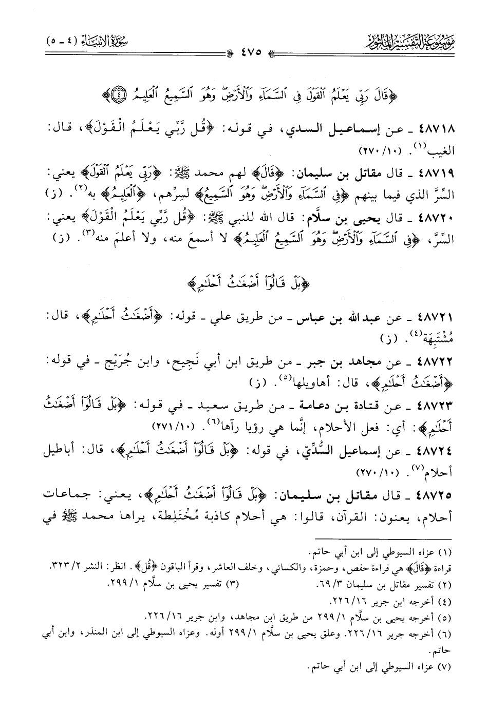 ٤٨٧٢٤ - عن إسماعيل السُّدِّيّ، في قوله: {بل قالوا أضغاث أحلام}، قال: أباطيل أحلام (¬٧). (١٠/ ٢٧٠)