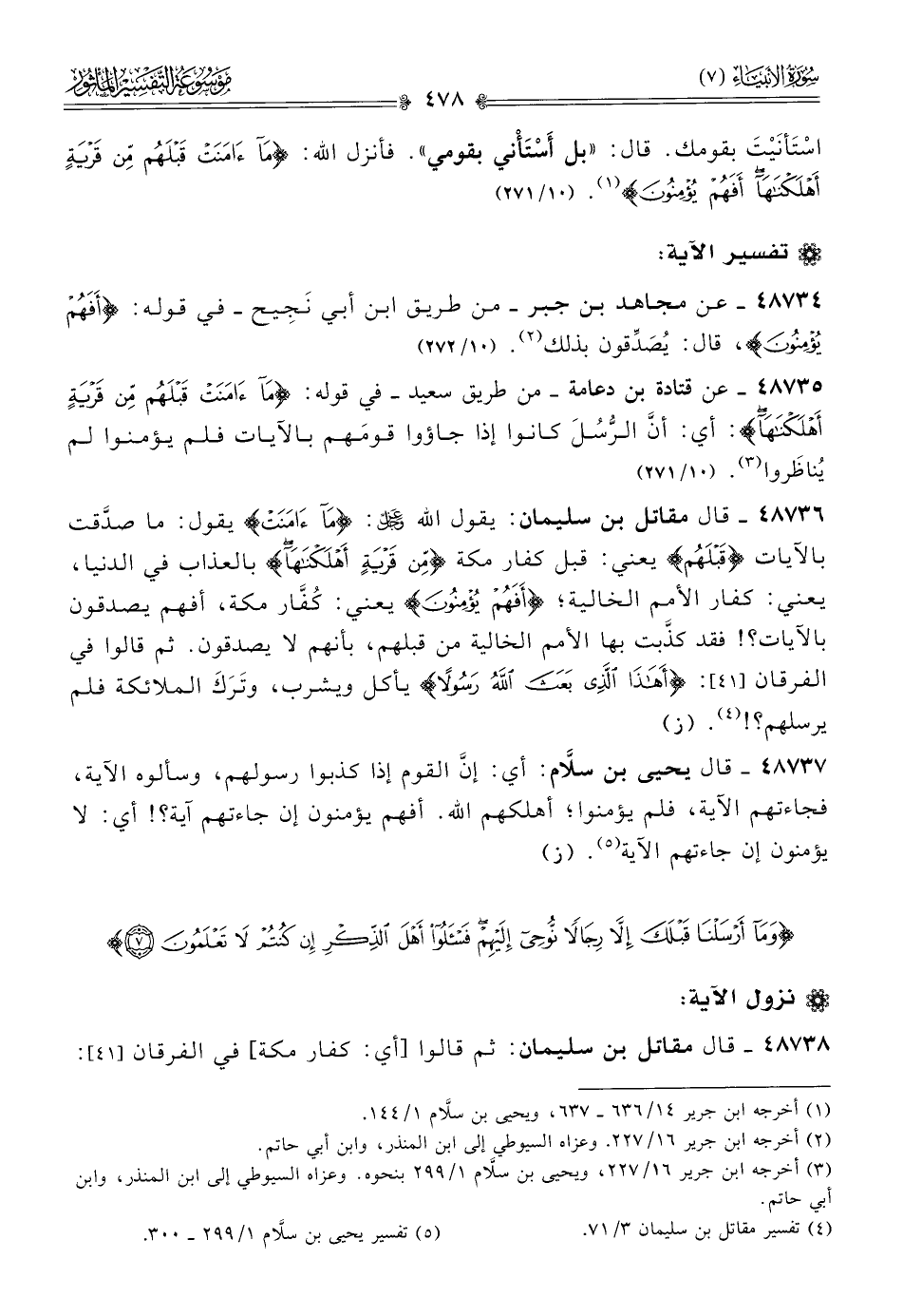 ٤٨٧٣٤ - عن مجاهد بن جبر -من طريق ابن أبي نَجِيح- في قوله: {أفهم يؤمنون}، قال: يُصَدِّقون بذلك (¬٢). (١٠/ ٢٧٢)