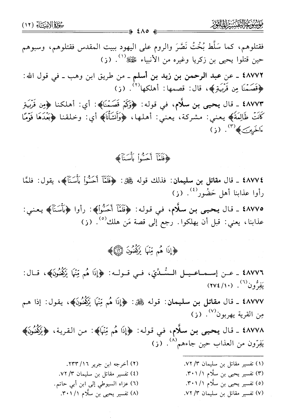 ٤٨٧٧٥ - قال يحيى بن سلّام، في قوله: {فلما أحسوا}: رأوا {بأسنا} يعني: عذابنا، يعني: قبل أن يهلكوا. رجع إلى قصة مَن هلك (¬٥). (ز)