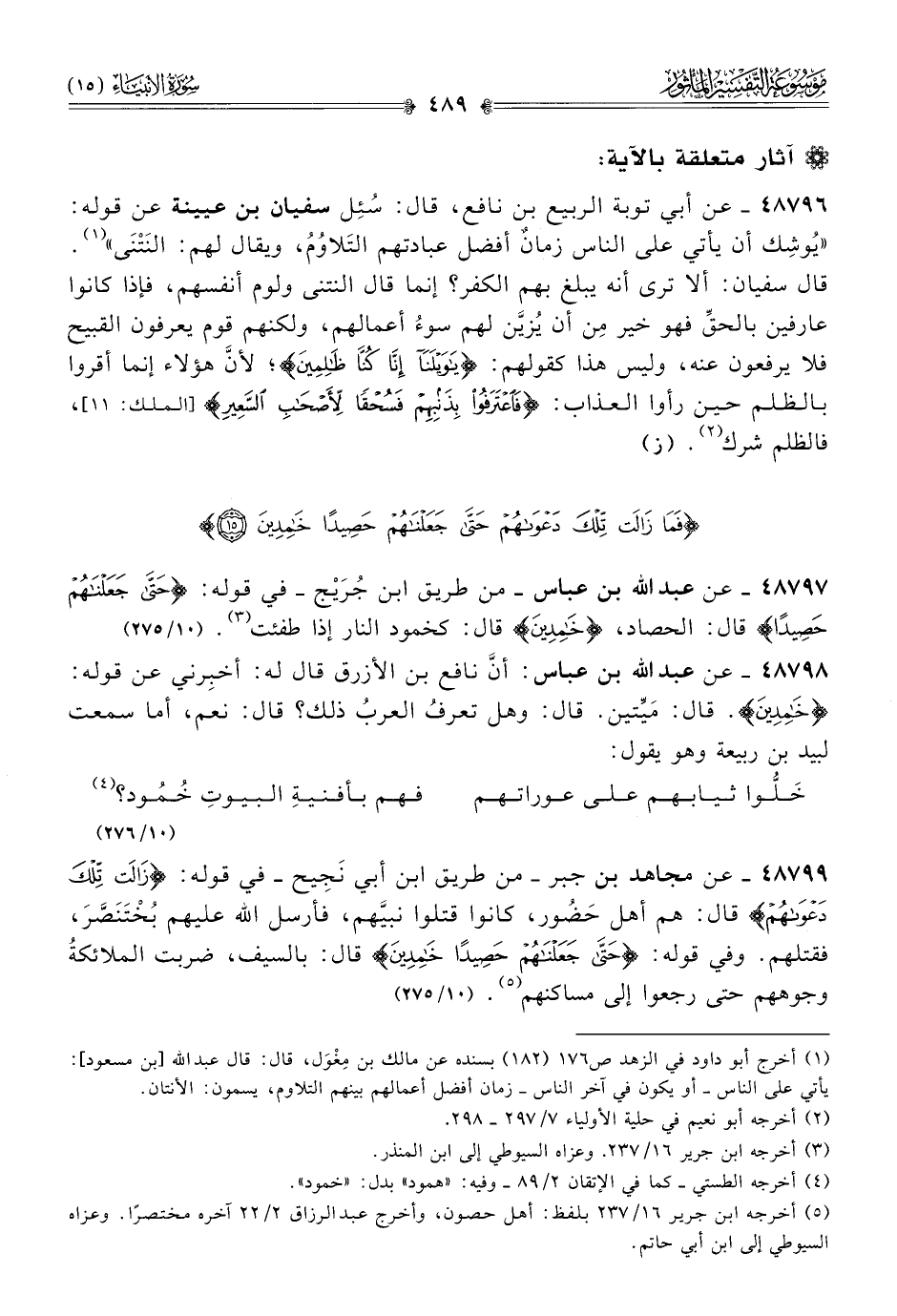 ٤٨٧٩٧ - عن عبد الله بن عباس -من طريق ابن جُرَيْج- في قوله: {حتى جعلناهم حصيدا} قال: الحصاد، {خامدين} قال: كخمود النار إذا طفئت (¬٣). (١٠/ ٢٧٥)