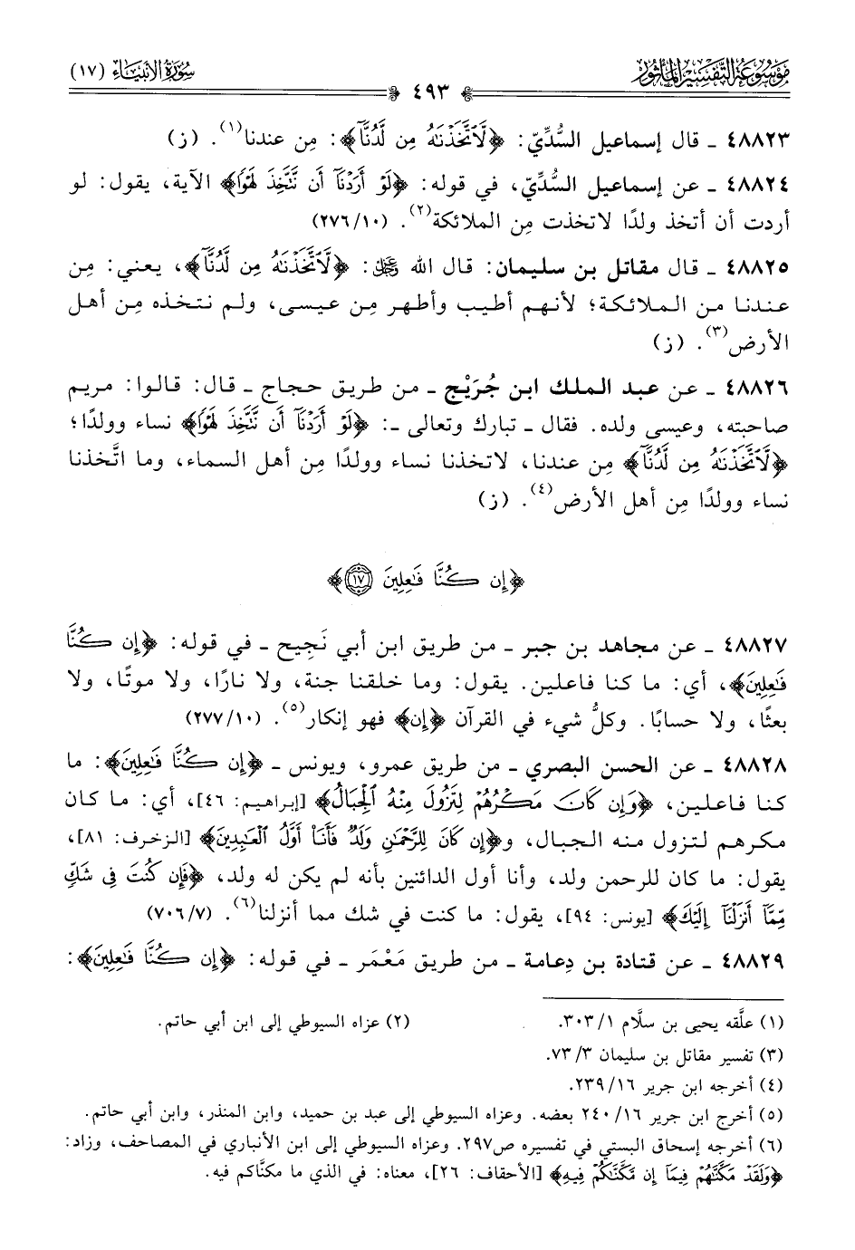 ٤٨٨٢٧ - عن مجاهد بن جبر -من طريق ابن أبي نَجِيح- في قوله: {إن كنا فاعلين}، أي: ما كنا فاعلين. يقول: وما خلقنا جنة، ولا نارًا، ولا موتًا، ولا بعثًا، ولا حسابًا. وكلُّ شيء في القرآن {إن} فهو إنكار (¬٥). (١٠/ ٢٧٧)