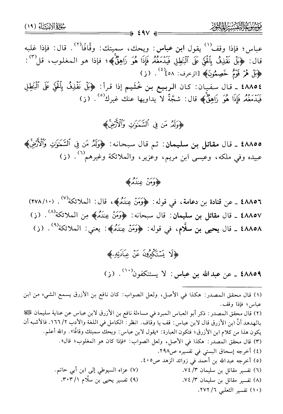 عباس؛ فإذا وقف (¬١) يقول ابن عباس: ويحك، سميتك: وقّافًا (¬٢). قال: فإذا غلبه قال: {بل نقذف بالحق على الباطل فيدمغه فإذا هو زاهق}؛ فإذا هو المغلوب، قل (¬٣) {بل هم قوم خصمون} (¬٤). (ز)
