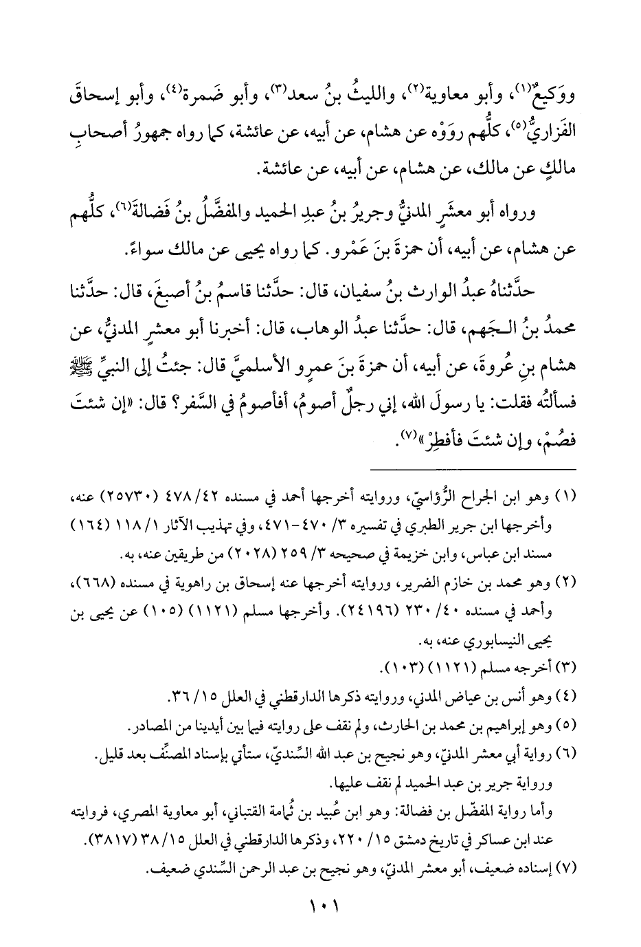 ورواه أبو معشَرٍ المدنيُّ وجريرُ بنُ عبدِ الحميد والمفضَّلُ بنُ فَضالةَ (¬٦)، كلُّهم عن هشام، عن أبيه، أن حمزةَ بنَ عَمْرو. كما رواه يحيى عن مالك سواءً.
