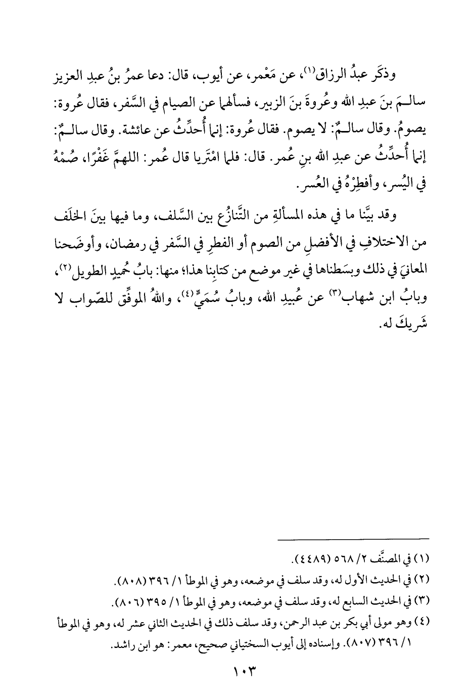 وذكَر عبدُ الرزاق (¬١)، عن مَعْمر، عن أيوب، قال: دعا عمرُ بنُ عبدِ العزيز سالمَ بنَ عبدِ اللَّه وعُروةَ بنَ الزبير، فسألهما عن الصيام في السَّفر، فقال عُروة: يصومُ. وقال سالمٌ: لا يصوم. فقال عُروة: إنما أُحدِّثُ عن عائشة. وقال سالمٌ: إنما أُحدِّثُ عن عبدِ اللَّه بنِ عُمر. قال: فلما امْتَريا قال عُمر: اللهمَّ غَفْرًا، صُمْهُ في اليُسر، وأفطِرْهُ في العُسر.