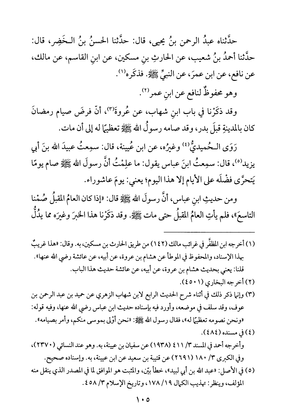ومن حديثِ ابنِ عباس، أنَّ رسولَ اللَّه -صلى اللَّه عليه وسلم- قال: "إذا كان العامُ المقبلُ صُمْنا التاسعَ"، فلم يأتِ العامُ المقبلُ حتى مات -صلى اللَّه عليه وسلم-. وقد ذكَرْنا هذا الخبرَ وغيرَه مما يدُلُّ
