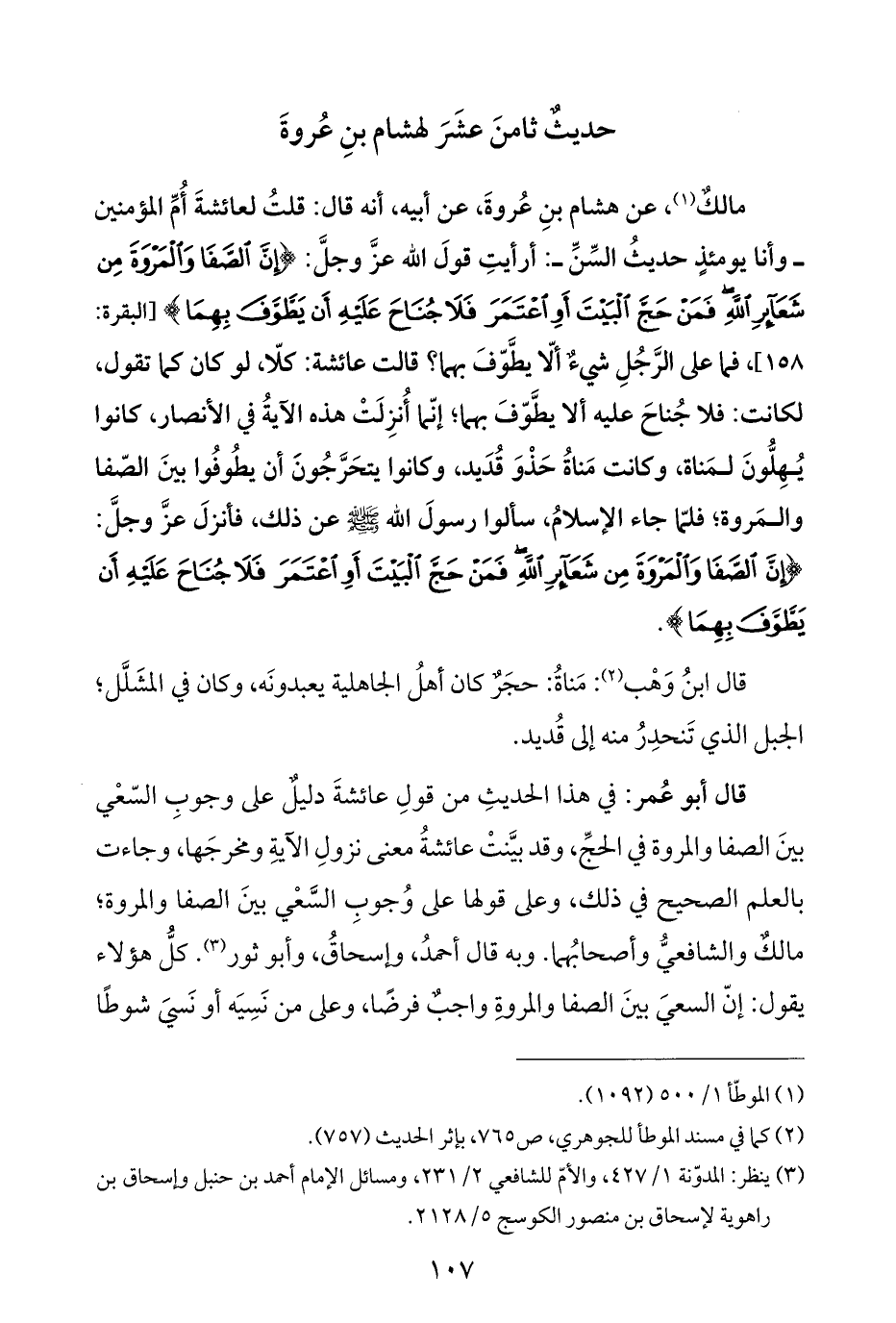 مالكٌ (¬١)، عن هشام بنِ عُروةَ، عن أبيه، أنه قال: قلتُ لعائشةَ أُمِّ المؤمنين -وأنا يومئذٍ حديثُ السِّنِّ-: أرأيتِ قولَ اللَّه عزَّ وجلَّ: {إِنَّ الصَّفَا وَالْمَرْوَةَ مِنْ شَعَائِرِ اللَّهِ فَمَنْ حَجَّ الْبَيْتَ أَوِ اعْتَمَرَ فَلَا جُنَاحَ عَلَيْهِ أَنْ يَطَّوَّفَ بِهِمَا} [البقرة: ١٥٨]، فما على الرَّجُلِ شيءٌ ألّا يطَّوّفَ بهما؟ قالت عائشة: كلّا، لو كان كما تقول، لكانت: فلا جُناحَ عليه ألا يطَّوّفَ بهما؛ إنّما أُنزِلَتْ هذه الآيةُ في الأنصار، كانوا يُهِلُّونَ لمَناة، وكانت مَناةُ حَذْوَ قُدَيد، وكانوا يتحَرَّجُونَ أن يطُوفُوا بينَ الصّفا والمَروة؛ فلمّا جاء الإسلامُ، سألوا رسولَ اللَّه -صلى اللَّه عليه وسلم- عن ذلك، فأنزلَ عزَّ وجلَّ: {إِنَّ الصَّفَا وَالْمَرْوَةَ مِنْ شَعَائِرِ اللَّهِ فَمَنْ حَجَّ الْبَيْتَ أَوِ اعْتَمَرَ فَلَا جُنَاحَ عَلَيْهِ أَنْ يَطَّوَّفَ بِهِمَا}.