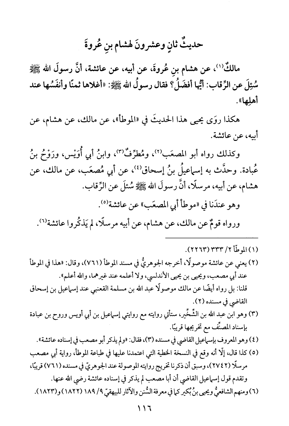 مالكٌ (¬١)، عن هشام بنِ عُروةَ، عن أبيه، عن عائشة، أنَّ رسولَ اللَّه -صلى اللَّه عليه وسلم- سُئِلَ عن الرِّقاب: أيُّها أفضَلُ؟ فقال رسولُ اللَّه -صلى اللَّه عليه وسلم-: "أغلاها ثمنًا وأنفَسُها عند أهلِها".