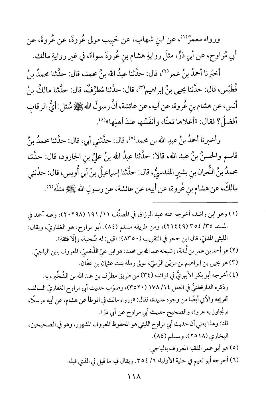 أخبَرنا أحمدُ بنُ عمر (¬٢)، قال: حدَّثنا عبدُ اللَّه بنُ محمد، قال: حدَّثنا محمدُ بنُ فُطَيْس، قال: حدَّثنا يحيى بنُ إبراهيم (¬٣)، قال: حدَّثنا مُطرِّفٌ، قال: حدَّثنا مالكُ بنُ أنس، عن هشام بنِ عُروة، عن أبيه، عن عائشة، أنَّ رسولَ اللَّه -صلى اللَّه عليه وسلم- سُئل: أيُّ الرقابِ أفضلُ؟ فقال: "أغلاها ثمنًا، وأنفَسُها عندَ أهلِها" (¬٤).