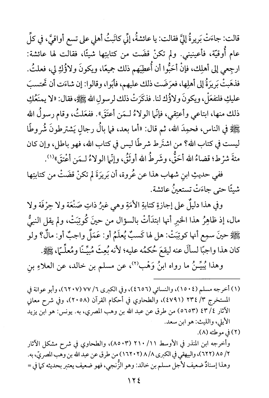 قالت: جاءَتْ بَريرةُ إليَّ فقالت: يا عائشةُ، إنِّي كاتَبتُ أهلي على تسع أواقيَّ، في كلِّ عام أُوقيّة، فأعينيني. ولم تكنْ قضَت من كتابتِها شيئًا، فقالت لها عائشة: ارجِعي إلى أهلِك، فإنْ أحَبُّوا أن أُعطِيَهم ذلك جميعًا، ويكونَ ولاؤُكِ لي، فعلتُ. فذهَبتْ بَريرَةُ إلى أهلِها، فعرَضَت ذلك عليهم، فاسبوا، وقالوا: إن شاءَت أن تَحتسبَ عليكِ فلتفعَلْ، ويكونَ ولاؤُك لنا. فذكَرَتْ ذلك لرسولِ الله - صلى الله عليه وسلم -، فقال: "لا يمنَعُكِ ذلك منها، ابتاعي وأعتِقي، فإنّما الولاءُ لمَن أعتَقَ". ففعَلتُ، وقام رسولُ الله - صلى الله عليه وسلم - في الناس، فحمِدَ الله، ثم قال: "أما بعد، فما بالُ رجالٍ يَشترطونَ شروطًا ليست في كتاب الله؟ من اشتَرط شرطًا ليس في كتاب الله، فهو باطل، وإن كان مئةَ شرْط؛ قضاءُ الله أحَقُّ، وشَرطُ الله أوثَقُ، وإنّما الولاءُ لمَن أعْتقَ" (¬١).