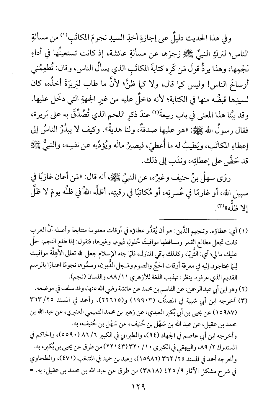 وفي هذا الحديث دليلٌ على إجارر أخذِ السيدِ نجومَ المكاتَبِ (¬١) من مسألةِ الناس؛ لتركِ النبيِّ - صلى الله عليه وسلم - زجرَها عن مسألةِ عائشة، إذ كانت تستعينُها في أداءِ نَجْمِها، وهذا يردُّ قولَ مَن كَرِه كتابةَ المكاتَبِ الذي يسألُ الناس، وقال: تُطعِمُني أوساخَ الناس! وليس كما قال، ولا كما ظنَّ؛ لأنَّ ما طاب لبَريرَةَ أخذُه، كان لسيدِها قبضُه منها في الكتابة؛ لأنه داخلٌ عليه من غيرِ الجهةِ التي دخَل عليها. وقد بيَّنا هذا المعنى في باب ربيعةَ (¬٢) عندَ ذكرِ اللحم الذي تُصُدِّقَ به على بَريرة، فقال رسولُ الله - صلى الله عليه وسلم -: "هو عليها صدقةٌ، ولنا هديةٌ". وكيف لا يبدُرُ الناسُ إلى إعطاءِ المكاتَب، ويَطيبُ له ما أُعطيَ، فيصيرُ مالَه ويُؤدِّيه عن نفسِه، والنبيُّ - صلى الله عليه وسلم - قد حَضَّ على إعطائِه، وندَب إلى ذلك.