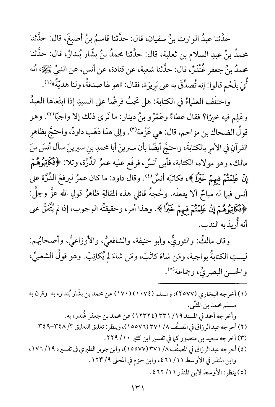 واختلَف العلماءُ في الكتابة: هل تجبُ فرضًا على السيدِ إذا ابتَغاها العبدُ وعَلِم فيه خيرًا؟ فقال عطاءٌ وعَمْرُو بنُ دينار: ما نَرى ذلك إلا واجبًا (¬٢). وهو قولُ الضحاك بن مزاحم، قال: هي عَزْمة (¬٣). وإلى هذا ذهَب داودُ، واحتجَّ بظاهرِ القرآنِ في الأمرِ بالكتابةَ، واحتجَّ أيضًا بأن سيرينَ أبا محمدِ بنِ سيرينَ سأل أنسَ بنَ مالك، وهو مولاه، الكتابة، فأبى أنسٌ، فرفَع عليه عمرُ الدِّرَّة، وتلا: {فَكَاتِبُوهُمْ إِنْ عَلِمْتُمْ فِيهِمْ خَيْرًا}، فكاتبَه أنسٌ (¬٤). وقال داود: ما كان عمرُ ليرفعَ الدِّرَّة على أنس فيما له مباحٌ ألا يفعلَه. وحُجةُ قائلي هذه المقالةِ ظاهرُ قولِ الله عزَّ وجلَّ: {فَكَاتِبُوهُمْ إِنْ عَلِمْتُمْ فِيهِمْ خَيْرًا}. وهذا أمر، وحقيقتُه الوجوب، إذا لم يُتَّفقْ على أنه أُريدَ به الندب.