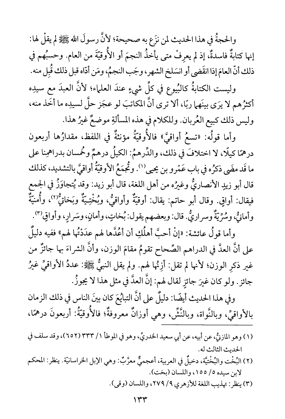 وأما قولُه: "تسعُ أواقيَّ" فالأُوقيّةُ مؤنثة في اللفظ، مقدارُها أربعون درهمًا كيلًا، لا اختلافَ في ذلك، والدِّرهمُ: الكيلُ درهمٌ وخُمسان بدراهمِنا على ما قَد مضَى ذكرُه في باب عَمْرو بن يحيى (¬١). وتُجمَعُ الأوقيّةُ أواقيَّ بالتشديد، كذلك قال أبو زيدٍ الأنصاريُّ وغيرُه من أهل اللغة، قال أبو زيد: وقد يُتجاوَزُ في الجمع فيقال: أواقٍ. وقال أبو حاتم: يقال: أوقيّةٌ وأواقيُّ، وبُخْتِيّةٌ وبَخاتيُّ (¬٢)، وأُمنيّةٌ وأمانيُّ، وسُرِّيّةٌ وسراريُّ. قال: وبعضهم يقول: بُخاتٍ، وأمانٍ، وسَرارٍ، وأواقٍ (¬٣).
