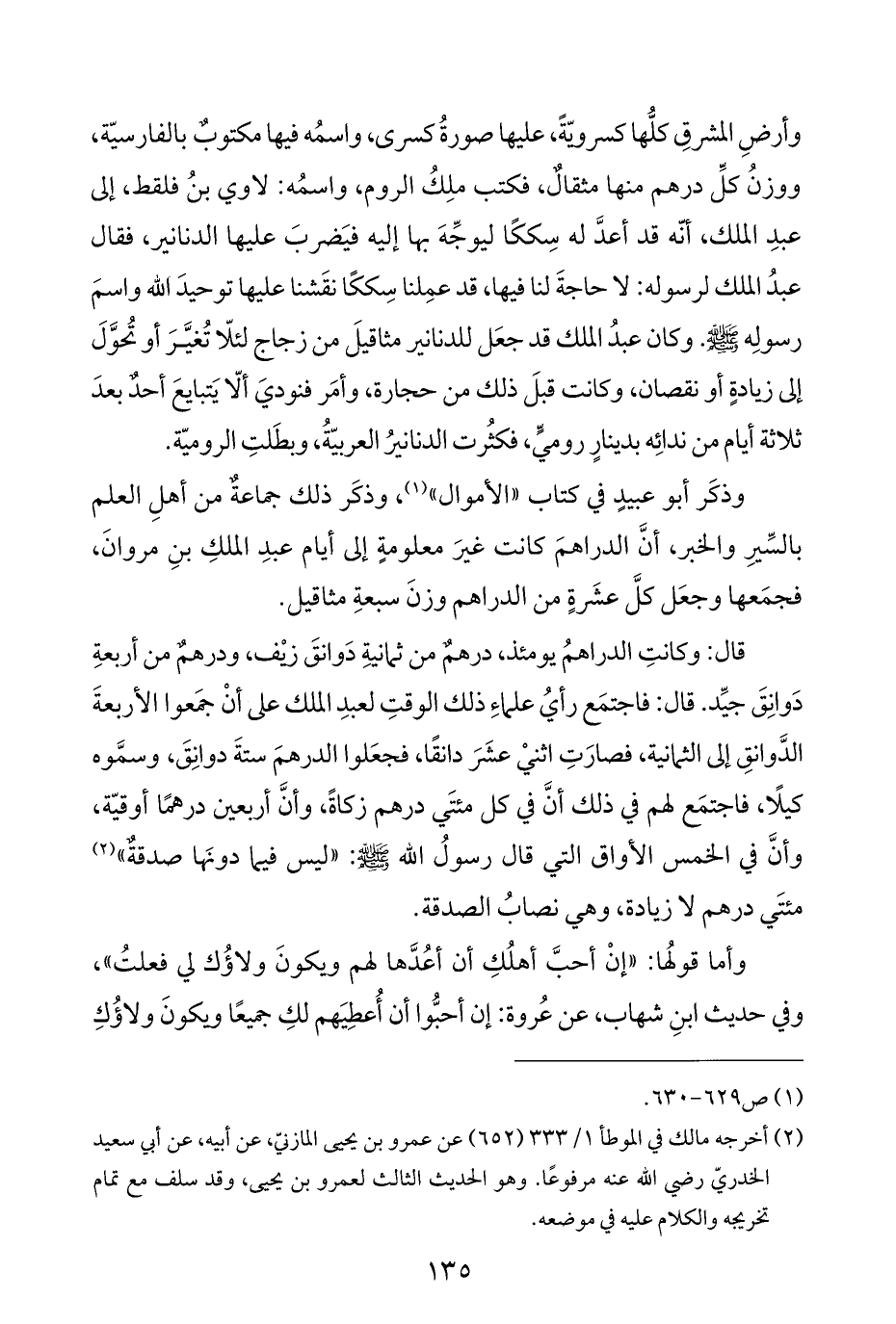 وأرضِ المشرقِ كلُّها كسرويّةً، عليها صورةُ كسرى، واسمُه فيها مكتوبٌ بالفارسيّة، ووزنُ كلِّ درهم منها مثقالٌ، فكتب ملِكُ الروم، واسمُه: لاوي بنُ فلقط، إلى عبدِ الملك، أنّه قد أعدَّ له سِككًا ليوجِّهَ بها إليه فيَضربَ عليها الدنانير، فقال عبدُ الملك لرسوله: لا حاجةَ لنا فيها، قد عمِلنا سِككًا نقَشنا عليها توحيدَ الله واسمَ رسولِه - صلى الله عليه وسلم -. وكان عبدُ الملك قد جعَل للدنانير مثاقيلَ من زجاج لئلّا تُغيَّرَ أو تُحوَّلَ إلى زيادةٍ أو نقصان، وكانت قبلَ ذلك من حجارة، وأمَر فنوديَ ألّا يَتبايعَ أحدٌ بعدَ ثلاثة أيام من ندائِه بدينارٍ روميٍّ، فكثُرت الدنانيرُ العربيّةُ، وبطَلتِ الروميّة.