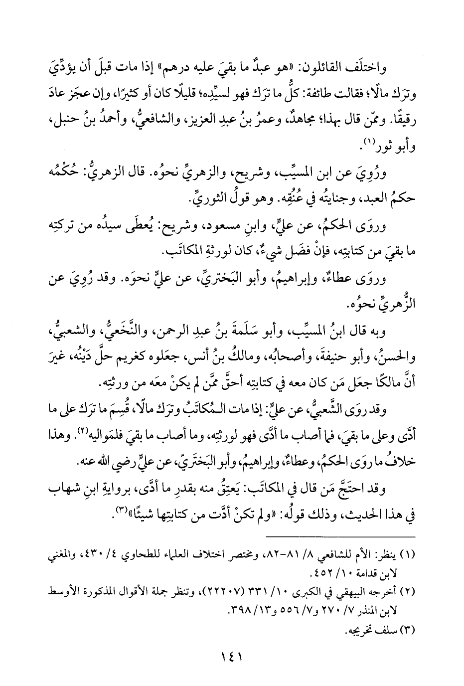 وبه قال ابنُ المسيِّب، وأبو سَلَمةَ بنُ عبدِ الرحمن، والنَّخَعيُّ، والشعبيُّ، والحسنُ، وأبو حنيفةَ، وأصحابُه، ومالكُ بنُ أنس، جعَلوه كغريم حلَّ دَيْنُه، غيرَ أنَّ مالكًا جعَل مَن كان معه في كتابتِه أحقَّ ممَّن لم يكنْ معَه من ورثتِه.