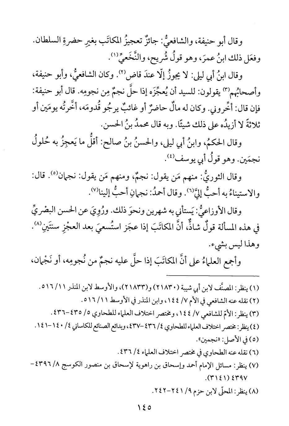 وقال أبو حنيفة، والشافعيُّ: جائزٌ تعجيزُ المكاتَب بغيرِ حضرةِ السلطان. وفعَل ذلك ابنُ عمرَ، وهو قولُ شُريح، والنَّخَعيِّ (¬١).