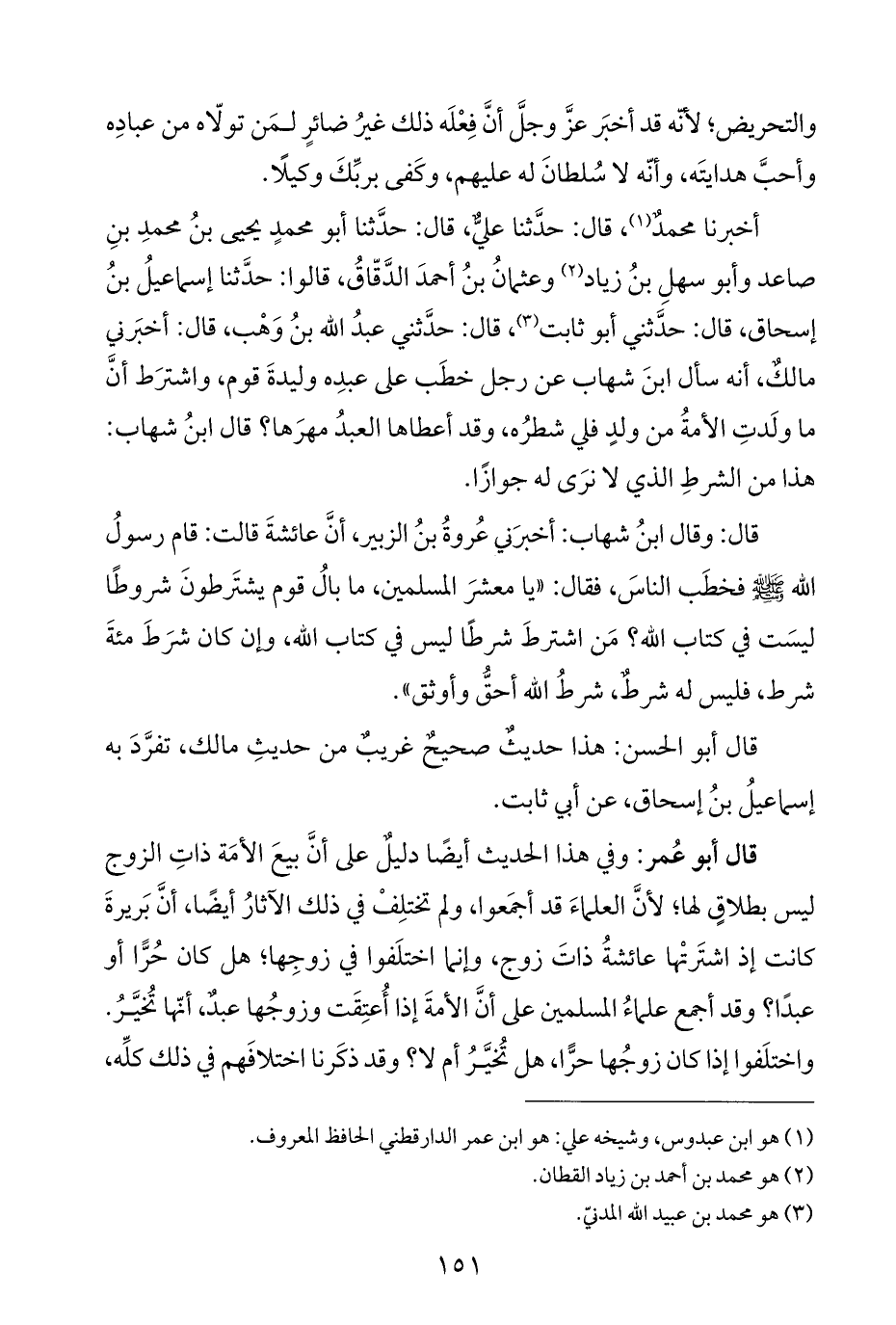 أخبرنا محمدٌ (¬١)، قال: حدَّثنا علي، قال: حدَّثني أبو محمدٍ يحيى بنُ محمدِ بنِ صاعد وأبو سهلِ بنُ زياد (¬٢) وعثمانُ بنُ أحمدَ الدَّقّاقُ، قالوا: حدَّثنا إسماعيلُ بنُ إسحاق، قال: حدَّثني أبو ثابت (¬٣)، قال: حدَّثني عبدُ الله بنُ وَهْب، قال: أخبَرني مالكٌ، أنه سأل ابنَ شهاب عن رجل خطَب على عبدِه وليدةَ قوم، واشترَط أنَّ ما ولَدتِ الأمةُ من ولدٍ فلي شطرُه، وقد أعطاها العبدُ مهرَها؟ قال ابنُ شهاب: هذا من الشرطِ الذي لا نرَى له جوازًا.