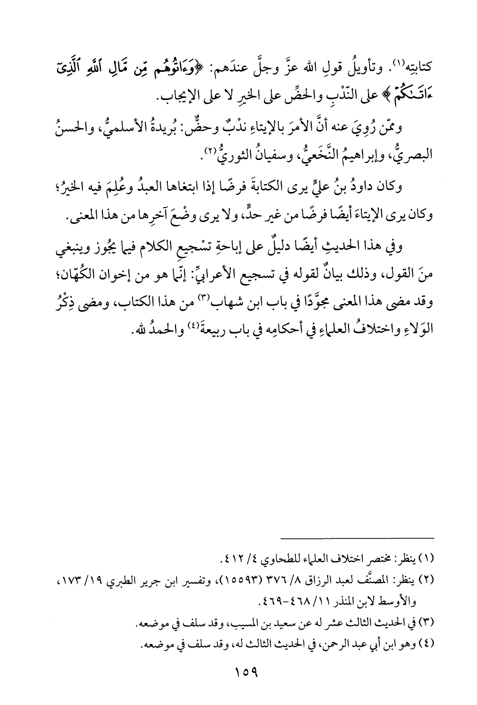 كتابتِه (¬١). وتأويلُ قولِ الله عزَّ وجلَّ عندَهم: {وَآتُوهُمْ مِنْ مَالِ اللَّهِ الَّذِي آتَاكُمْ} على النّدْبِ والحضِّ على الخيرِ لا على الإيجاب.