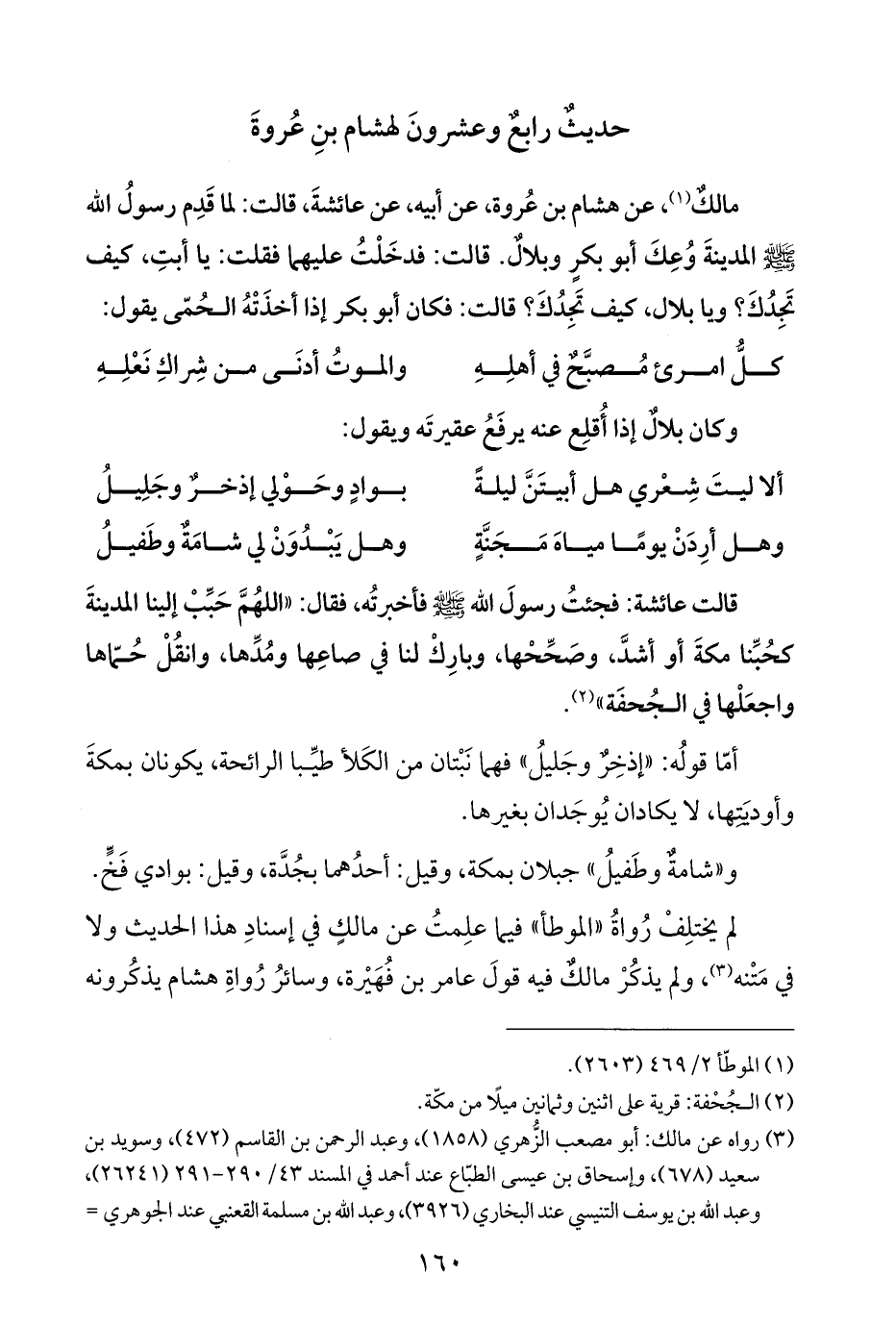 مالكٌ (¬١)، عن هشام بن عُروة، عن أبيه، عن عائشةَ، قالت: لما قَدِم رسولُ الله - صلى الله عليه وسلم - المدينةَ وُعِكَ أبو بكرٍ وبلالٌ. قالت: فدخَلْتُ عليهما فقلت: يا أبتِ، كليف تَجِدُكَ؟ ويا بلال، كيف تَجِدُكَ؟ قالت: فكان أبو بكر إذا أخذَتْهُ الحُمّى يقول: