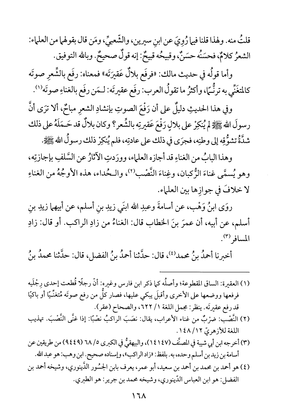 وهذا البابُ من الغناءِ قد أجازه العلماء، وورَدتِ الآثارُ عن السَّلفِ بإجازته، وهو يُسمَّى غناءَ الرُّكبان، وغِناءَ النَّصْب (¬٢)، والحُداء، هذه الأوجُهُ من الغناءِ لا خلافَ في جوازِها بين العلماء.
