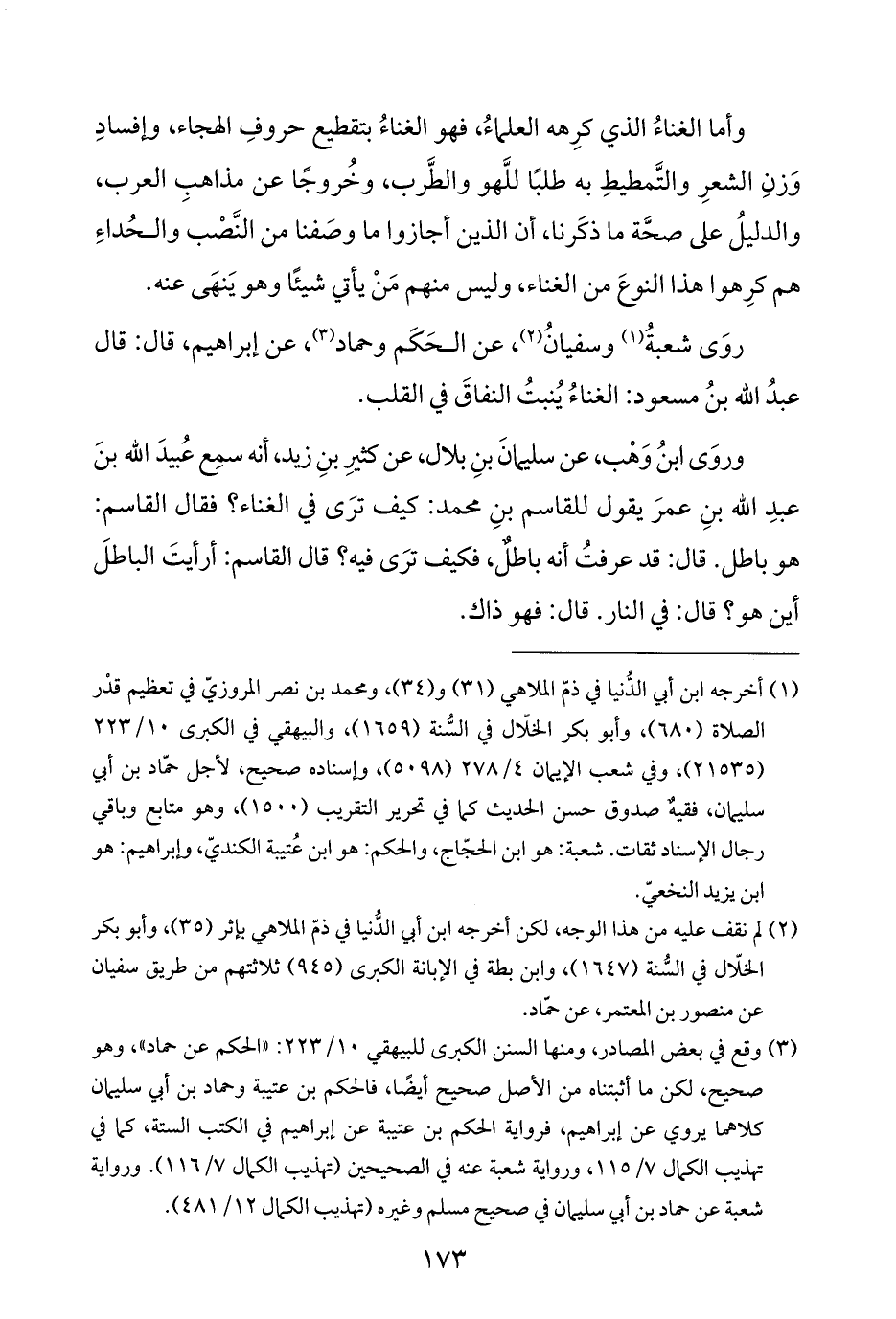 (¬١) أخرجه ابن أبي الدُّنيا في ذمّ الملاهي (٣١) و (٣٤)، ومحمد بن نصر المروزيّ في تعظيم قدْر الصلاة (٦٨٠)، وأبو بكر الخلّال في السُّنة (١٦٥٩)، والبيهقي في الكبرى ١٠/ ٢٢٣ (٢١٥٣٥)، وفي شعب الإيمان ٤/ ٢٧٨ (٥٠٩٨)، وإسناده صحيح، لأجل حمّاد بن أبي سليمان، فقيهٌ صدوق حسن الحديث كما في تحرير التقريب (١٥٠٠)، وهو متابع وباقي رجال الإسناد ثقات. شعبة: هو ابن الحجّاج، والحكم: هو ابن عُتيبة الكنديّ، وإبراهيم: هو ابن يزيد النخعيّ.