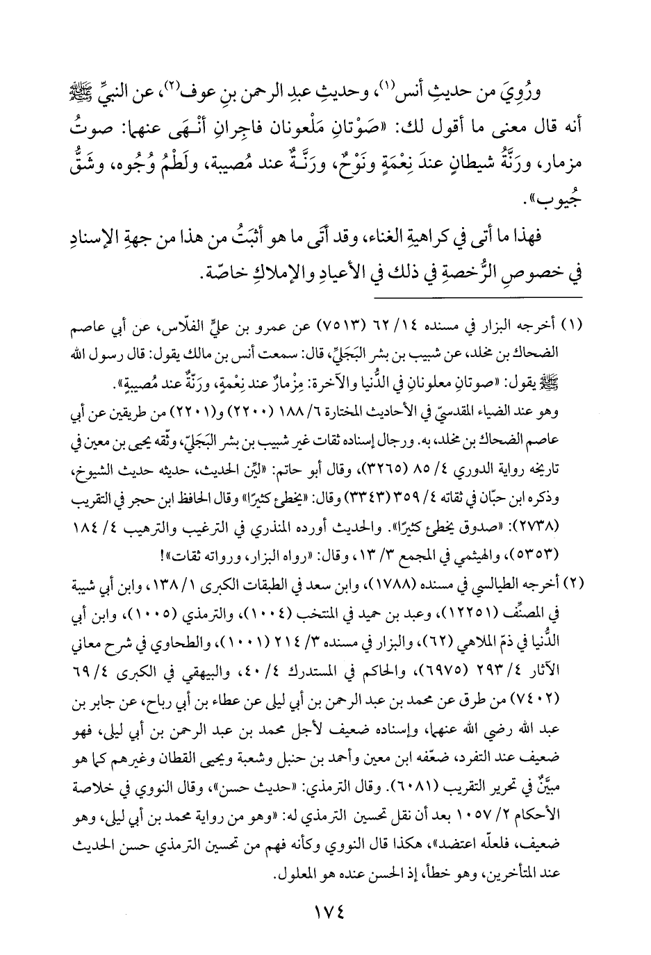 فهذا ما أتى في كراهيةِ الغناء، وقد أتَى ما هو أثبَتُ من هذا من جهةِ الإسنادِ في خصوصِ الرُّخصةِ في ذلك في الأعيادِ والإملاكِ خاصّة.