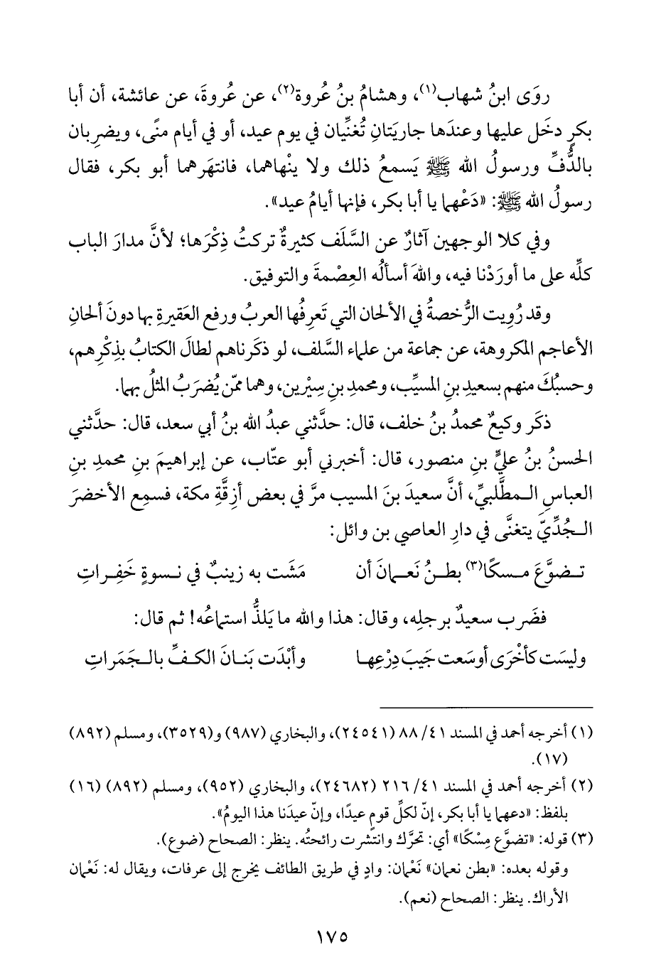 وقد رُوِيت الرُّخصةُ في الألحان التي تَعرِفُها العربُ ورفع العَقيرةِ بها دونَ ألحانِ الأعاجم المكروهة، عن جماعة من علماء السَّلف، لو ذكَرناهم لطالَ الكتابُ بذِكْرِهم، وحسبُكَ منهم بسعيدِ بنِ المسيِّب، ومحمدِ بنِ سِيْرين، وهما ممّن يُضرَبُ المثلُ بهما.