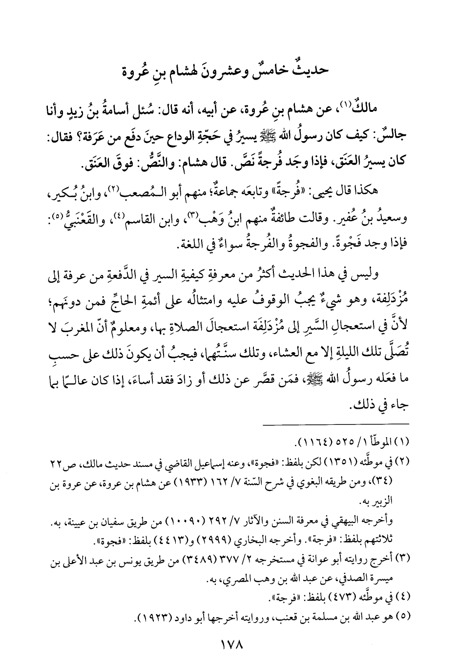 مالكٌ (¬١)، عن هشام بنِ عُروة، عن أبيه، أنَّه قال: سُئل أسامةُ بنُ زيدٍ وأنا جالسٌ: كيف كان رسولُ الله - صلي الله عليه وسلَّم - يسيرُ في حَجّةِ الوداع حينَ دفَع من عَرَفة؟ فقال: كان يسيرُ العَنَق، فإذا وجَد فُرجةً نَصَّ. قال هشام: والنَّصُّ: فوقَ العَنَق.