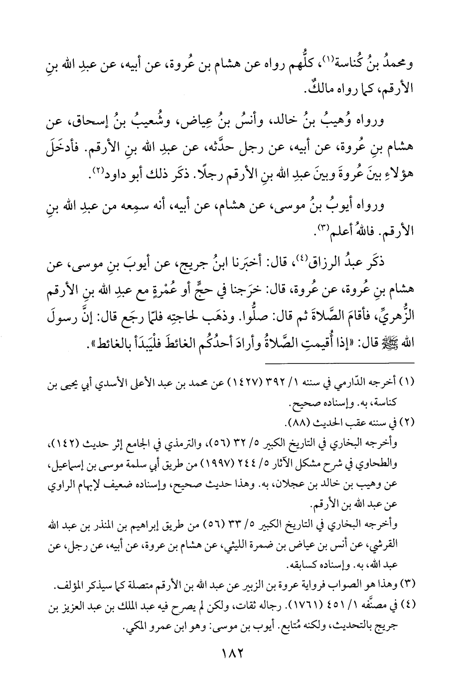 ورواه وُهيبُ بنُ خالد، وأنسُ بنُ عِياض، وشُعيبُ بنُ إسحاق، عن هشام بنِ عُروة، عن أبيه، عن رجل حدَّثه، عن عبدِ الله بنِ الأرقم. فأدخَلَ هؤلاءِ بينَ عُروةَ وبينَ عبدِ الله بنِ الأرقم رجلًا. ذكَر ذلك أبو داود (¬٢).