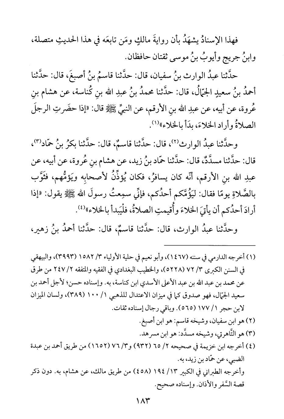 وحدَّثنا عبدُ الوارث (¬٢)، قال: حدَّثنا قاسمٌ، قال: حدَّثنا بكرُ بنُ حمّاد (¬٣)، قال: حدَّثنا مسدَّدٌ، قال: حدَّثنا حمّاد بنُ زيد، عن هشام بنِ عُروة، عن أبيه، عن عبدِ الله بنِ الأرقم، أنّه كان يسافرُ، فكان يُؤذِّنُ لأصحابِه ويَؤمُّهم، فثَوَّب بالصَّلاةِ يومًا فقال: ليَؤُمَّكم أحدُكم، فإنِّي سمِعتُ رسولَ الله - صلي الله عليه وسلَّم - يقول: "إذا أرادَ أحدُكم أن يأتيَ الخلاءَ وأُقيمتِ الصلاةُ، فلْيَبدأ بالخلاء" (¬٤).