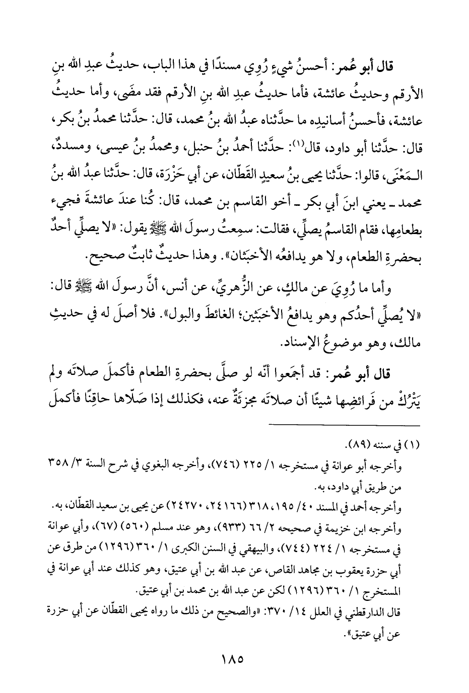 قال أبو عُمر: أحسنُ شيءٍ رُوِي مسندًا في هذا الباب، حديثُ عبدِ الله بنِ الأرقم وحديثُ عائشة، فأما حديثُ عبدِ الله بنِ الأرقم فقد مضَى، وأما حديثُ عائشة، فأحسنُ أسانيدِه ما حدَّثناه عبدُ الله بنُ محمد، قال: حدَّثنا محمدُ بنُ بكر، قال: حدَّثنا أبو داود، قال (¬١): حدَّثنا أحمدُ بنُ حنبل، ومحمدُ بنُ عيسى، ومسددٌ، المَعْنَى، قالوا: حدَّثنا يحيى بنُ سعيدٍ القَطّان، عن أبي حَزْرَة، قال: حدَّثنا عبدُ الله بنُ محمد - يعني ابنَ أبي بكر - أخو القاسم بن محمد، قال: كُنا عندَ عائشةَ فجيء بطعامِها، فقام القاسمُ يصلِّي، فقالت: سمِعتُ رسولَ الله - صلي الله عليه وسلَّم - يقول: "لا يصلِّي أحدٌ بحضرةِ الطعام، ولا هو يدافعُه الأخبَثان". وهذا حديثٌ ثابتٌ صحيح.