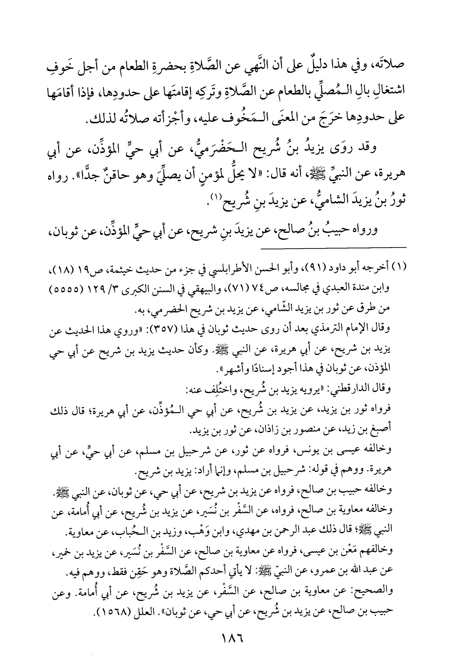 وقد روَى يزيدُ بنُ شُريح الحَضْرَميُّ، عن أبي حيٍّ المؤذِّن، عن أبي هريرة، عن النبيِّ - صلى الله عليه وسلم -، أنَّه قال: "لا يحلُّ لمؤمنٍ أن يصلِّيَ وهو حاقنٌ جدًّا". رواه ثورُ بنُ يزيدَ الشاميُّ، عن يزيدَ بنِ شُريح (¬١).