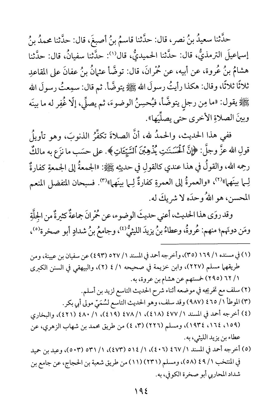 حدَّثنا سعيدُ بنُ نصر، قال: حدَّثنا قاسمُ بنُ أصبغَ، قال: حدَّثنا محمدُ بنُ إسماعيلَ الترمذيُّ، قال: حدَّثنا الحميديُّ، قال (¬١): حدَّثنا سفيانُ، قال: حدَّثنا هشامُ بنُ عُروة، عن أبيه، عن حُمْرانَ، قال: توضَّأ عثمانُ بنُ عفانَ على المقاعدِ ثلاثًا ثلاثًا، وقال: هكذا رأيتُ رسولَ الله - صلى الله عليه وسلَّم - يتوضَّأ. ثم قال: سمِعتُ رسولَ الله - صلى الله عليه وسلَّم - يقول: "ما مِن رجلٍ يتوضَّأ، فيُحسِنُ الوضوءَ، ثم يصلِّي، إلّا غُفِر له ما بينَه وبينَ الصلاةِ الأخرى حتى يصلِّيَها".
