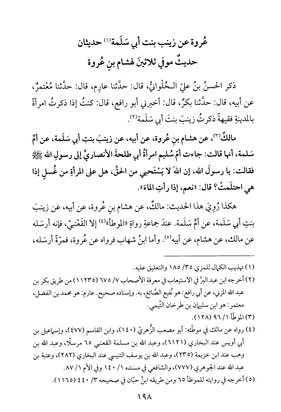 هكذا رُوِيَ هذا الحديث: مالكٌ، عن هشام بنِ عُروة، عن أبيه، عن زينبَ بنتِ أبي سَلَمة، عن أمِّ سَلَمة. عندَ جماعةِ رواةِ "الموطأ" (¬٤) إلا القَعْنبيّ، فإنه أرسَله عن مالك، عن هشام، عن أبيه (¬٥). وأما ابنُ شهاب فرواه عن عُروة، فمرّةً أرسَله،