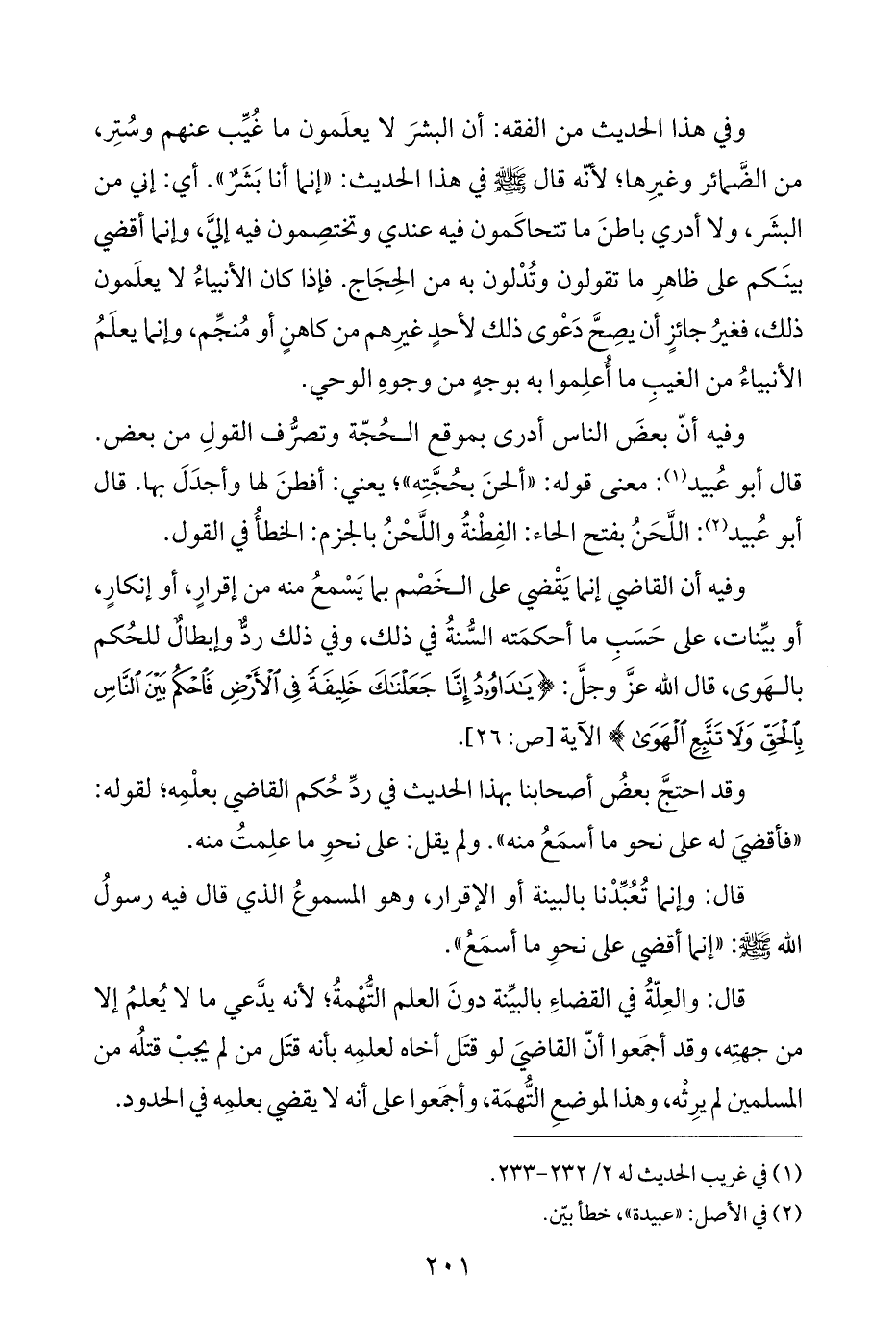 وفي هذا الحديث من الفقه: أن البشرَ لا يعلَمون ما غُيِّب عنهم وسُتِر، من الضَّمائر وغيرِها؛ لأنّه قال - صلى الله عليه وسلم - في هذا الحديث: "إنما أنا بَشَرٌ". أي: إني من البشَر، ولا أدري باطنَ ما تتحاكَمون فيه عندي وتختصِمون فيه إليَّ، وإنما أقضي بينَكم على ظاهرِ ما تقولون وتُدْلون به من الحِجَاج. فإذا كان الأنبياءُ لا يعلَمون ذلك، فغيرُ جائزٍ أن يصِحَّ دَعْوى ذلك لأحدٍ غيرِهم من كاهنٍ أو مُنجِّم، وإنما يعلَمُ الأنبياءُ من الغيبِ ما أعلِموا به بوجهٍ من وجوهِ الوحي.