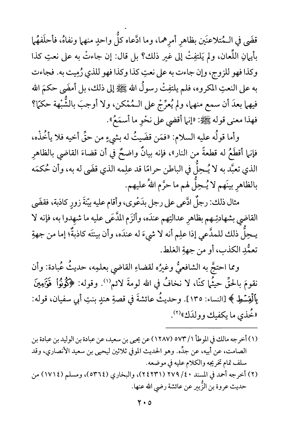 وأما قولُه عليه السلام: "فمَن قضَيتُ له بشيءٍ من حقِّ أخيه فلا يأخُذْه، فإنما أقطَعُ له قطعةً من النار"، فإنه بيانٌ واضحٌ في أن قضاءَ القاضي بالظاهرِ الذي تعبَّد به لا يُحِلُّ في الباطن حرامًا قد علِمه الذي قضَى له به، وأن حُكمَه بالظاهرِ بينَهم لا يُحِلُّ لهم ما حرَّم اللهُ عليهم.